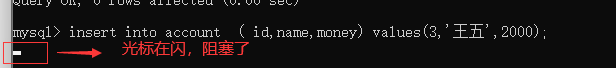 mysql> insert into account ( id,name,money) values(3,'王五',2000); Query OK, 1 row affected (0.00 sec)这个时候窗口2还想插入,仍然无法插入,被阻塞